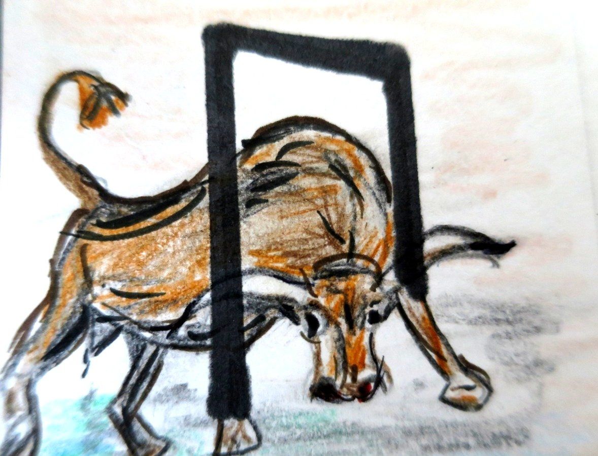 Deutung: Urfeuer - Lebensfeuer, Überlebenskampf, aber auch Tiere, im speziellen Rinder im Sinne von (beweglicher) Besitz auch Opfertier