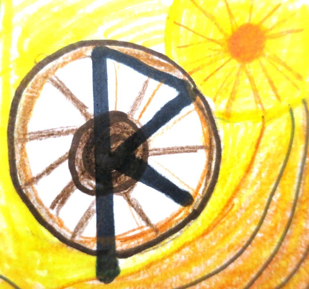 Deutung: Rad, Kreis, Bewegung, Jahreszyklus, auf die Reise gehen auch im Sinne von (Vision) Suchen. Für den Schamanen ist es immer die Reise in andere Welten um Erfahrung zu sammeln und anderen Rat zu geben